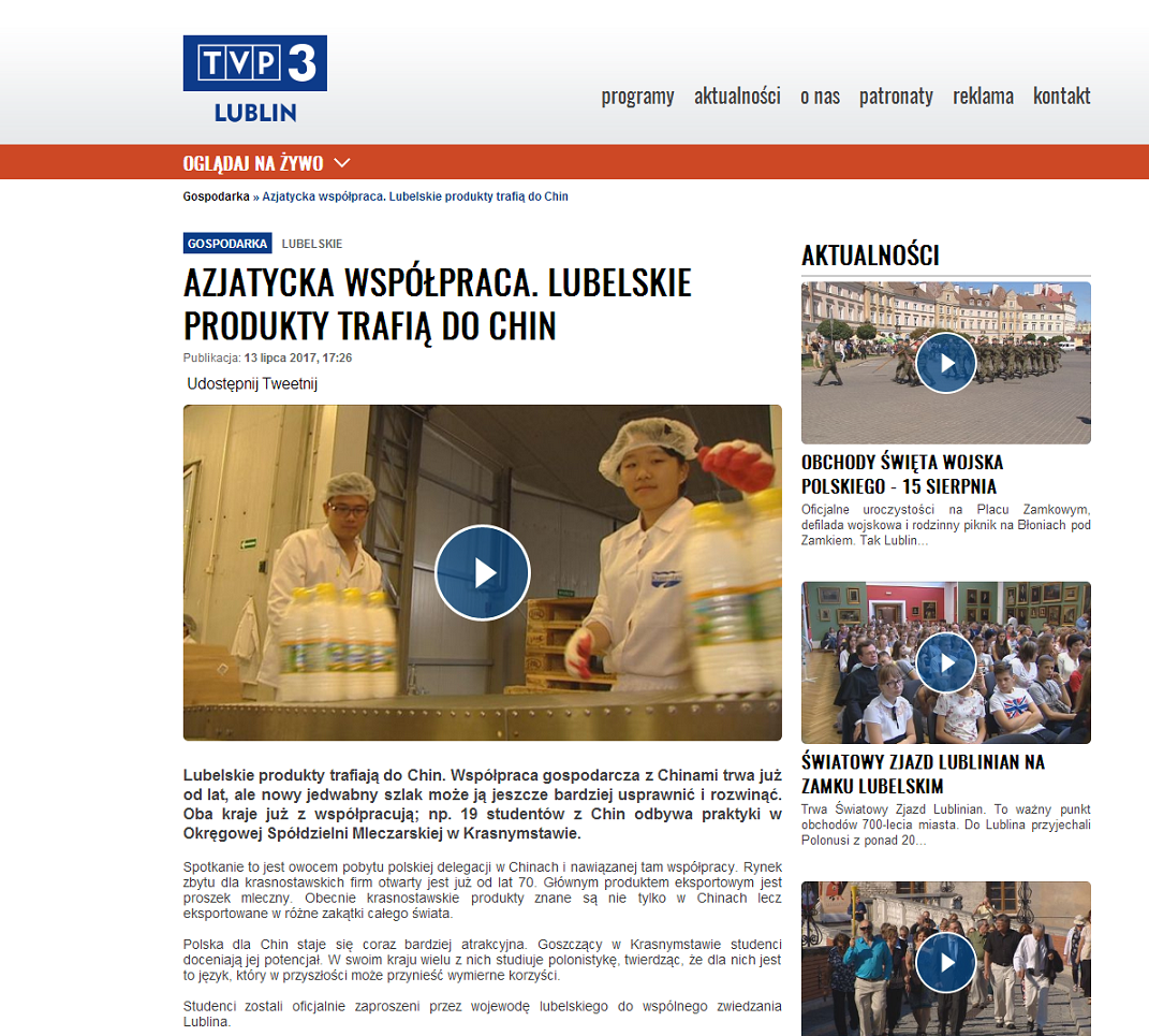 7月13日,卢布林省省督普柴米斯瓦夫·查尔奈克(Przemysław Czarnek)莅临乳制品合作社参观并慰问广外的员工,随行的卢布林电视台记者对员工和相关工作人员进行了采访。报道指出,中波两国的经济合作由来已久,而“一带一路”合作倡议的提出,则为两国合作水平的提升和发展提供了崭新的机遇。