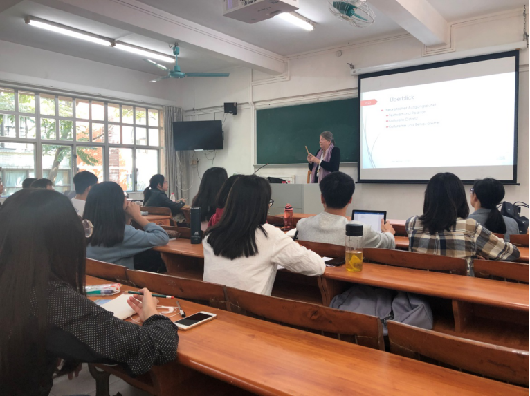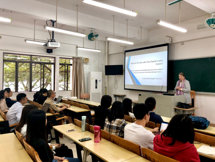 本网讯 2019年10月28日至29日,德国功能学派代表人物、德国马格德堡应用科技大学荣休教授、前马格德堡应用科技大学副董事长克里斯蒂安娜·诺德教授前来广外德语系,为德语学硕和专硕研究生,以及全体本科生举办了两场关于功能学派翻译理论与实践的讲座。讲座由德语系教师、中德文学关系创新团队成员崔涛涛老师主持。