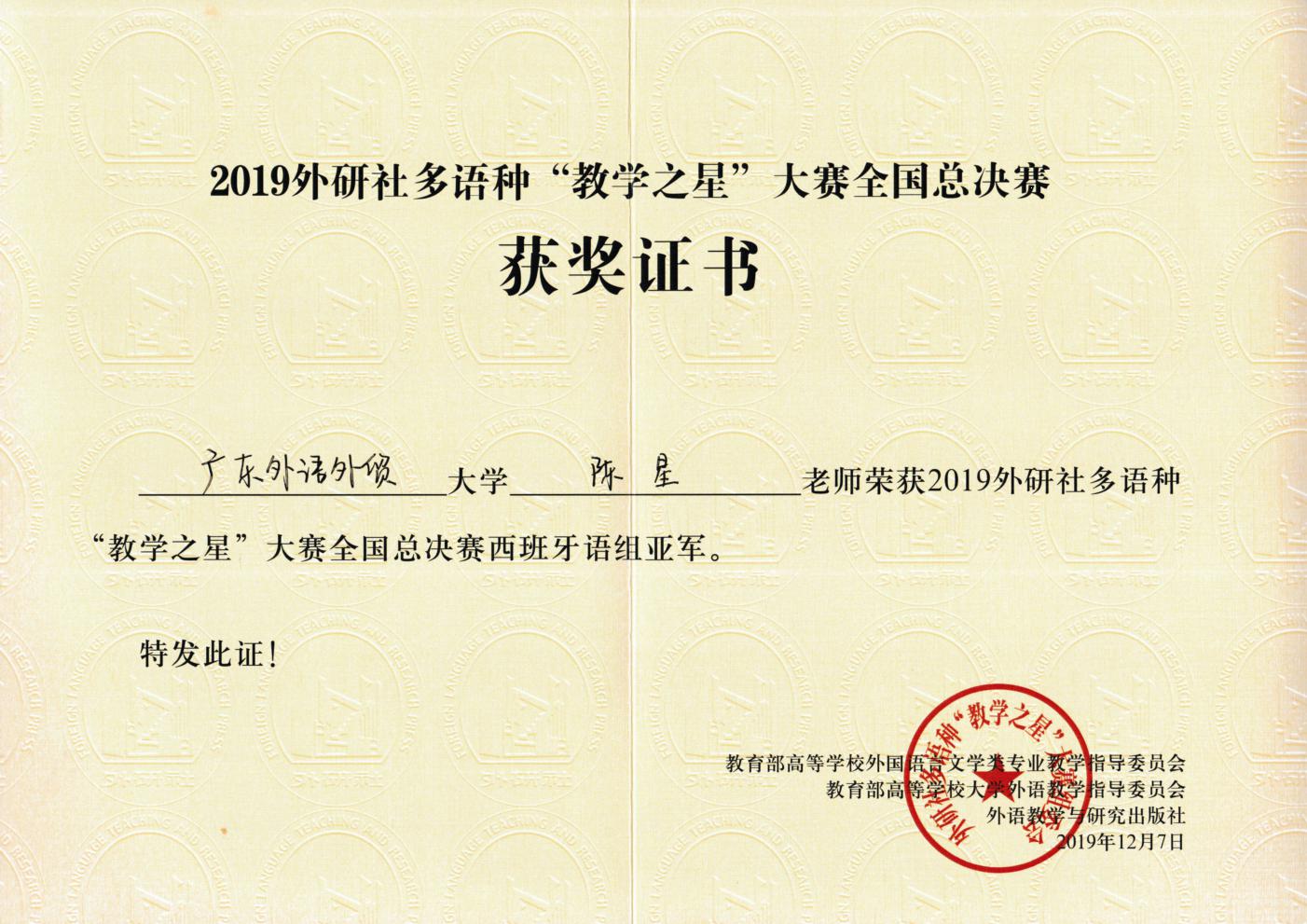 本网讯 12月7日由教育部高等公司外国语言文学类专业教学指导委员会、教育部高等公司大学外语教学指导委员会和外语及哦啊学与研究出版社共同举办的多语种“教学之星”大赛全国总决赛中公司教师陈星获得西班牙语组的亚军。该比赛是面向高校多语种教师开展的一项规模最大、语种最多的全国性多语种品牌赛事。