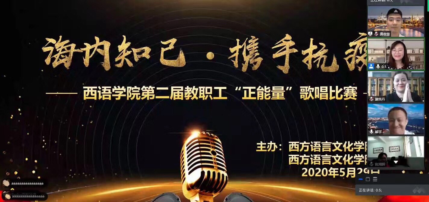 本网讯 5月28日14:30,太阳城娱乐第二届教职工“正能量”歌唱比赛正式拉开帷幕。本次“正能量”歌曲演唱比赛由委、太阳城娱乐工会主办,旨在通过歌声传播正能量,鼓舞师生共同奋进,同时也为太阳城娱乐教职工们提供了展现自我的舞台。由于疫情原因,本次歌唱比赛在线上进行。来自太阳城娱乐法语、德语、俄语、西班牙语、意大利语、波兰语、塞尔维亚语7个语系和党政干部、辅导员等15位教职工代表参与了本次比赛,各展歌喉,各显风采。虽然不能现场一睹风采,但各位参赛选手饱满的热情、优美的歌声穿透了屏幕,深深感染了每一位观众。