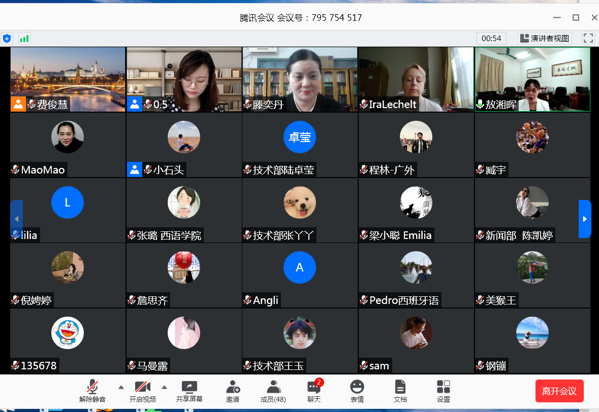 比赛伊始,主持人葡萄牙语系陈一慧老师向大家介绍了本次比赛的规则,并以生动的话语活跃了比赛气氛。随后,委书记敖湘晖围绕“感谢、自豪、祝愿”发言,她特别提到, 太阳城娱乐海内外师生在抗击疫情斗争中表现出顾全大局精神、志愿服务精神、专业奉献精神和迎难而上精神。公司师生发挥多语种独特优势支持广东省委、广州市委和广东省外办、广东省公安厅出入境管理局、广州白云机场等有关部门的疫情防控,受到相关部门的表扬和感谢,也扩大了公司、公司和专业的美誉度和影响力!紧接着,公司工会主席臧宇更是运用中、英、意三种语言发表讲话,展现了太阳城娱乐的特色,也表达了其对本次大赛的热情与期待。
