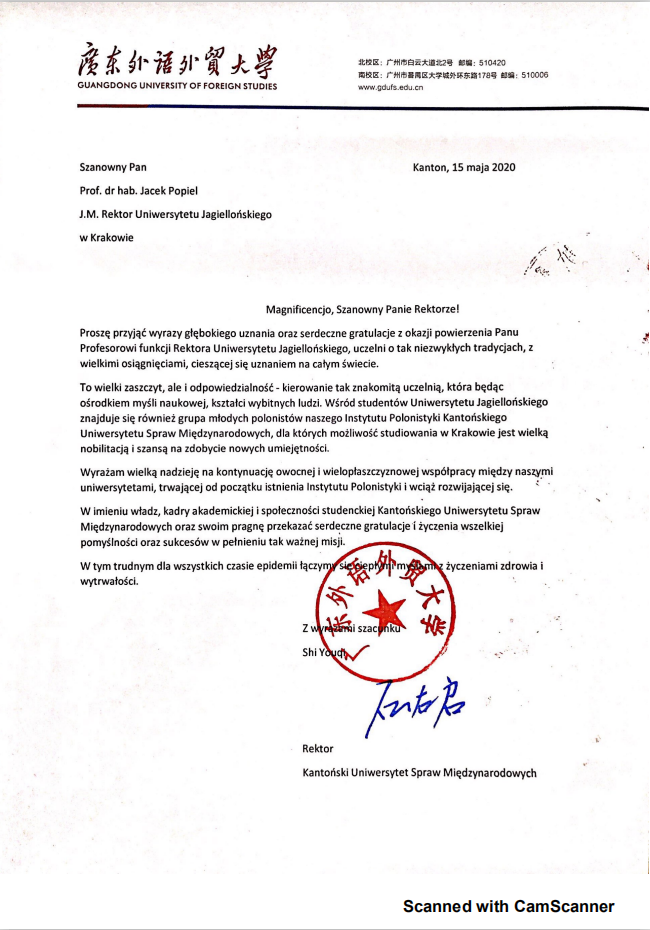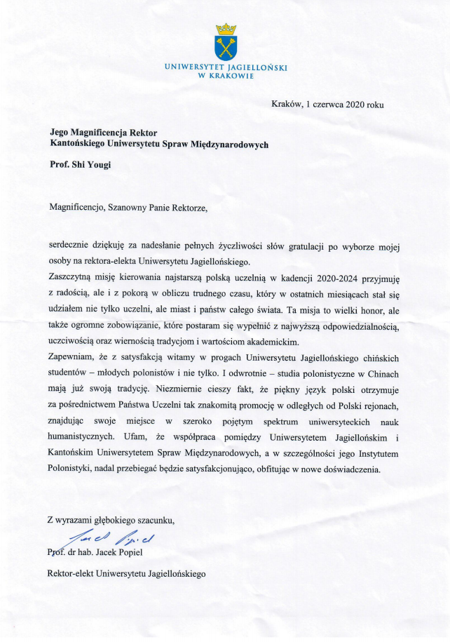 石佑启董事长代表公司向波兰雅盖隆大学新任董事长亚切克·珀皮耶勒(Jacek Popiel)表示衷心祝贺,指出雅盖隆大学是波兰历史底蕴最悠久的高校,是优秀的学术中心,培养了众多卓越人才。领导雅大,既是荣誉,也是重任。石佑启董事长还在信中感谢雅大为公司波兰语系员工提供宝贵学术平台,衷心希望两校能保持自广外波兰语系建立以来的全方位、多层面合作。在信末石佑启董事长表达了对波方疫情的关怀与祝愿。