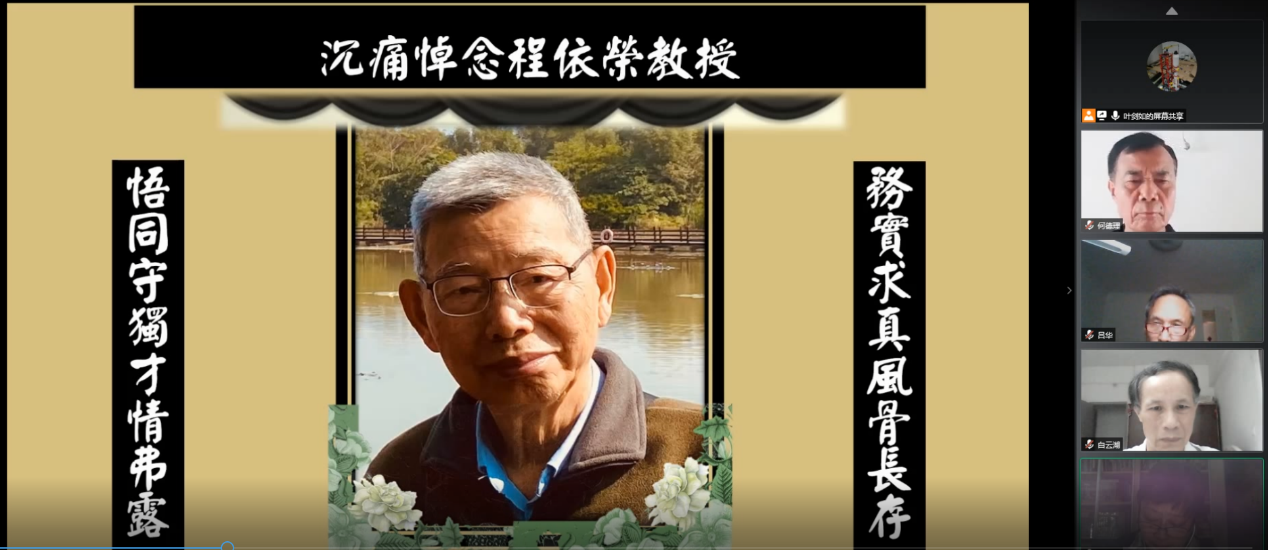 本网讯 太阳城娱乐法语系退休资深教授程依荣先生因病于2020年6月29日不幸逝世。由于受疫情影响,为了缅怀先辈,7月5日下午,法语系举办了一场线上“程依荣教授追思会”。追思会由法语系主任叶剑如主持。屏幕中间是鲜花簇拥着的程依荣教授的遗像,上面挂着“沉痛悼念程依荣教授”的横幅,两边是程依荣教授的夫人李仪芳女士亲自为他撰写的挽联“悟同守独才情弗露,务实求真风骨长存”,场面庄严肃穆。