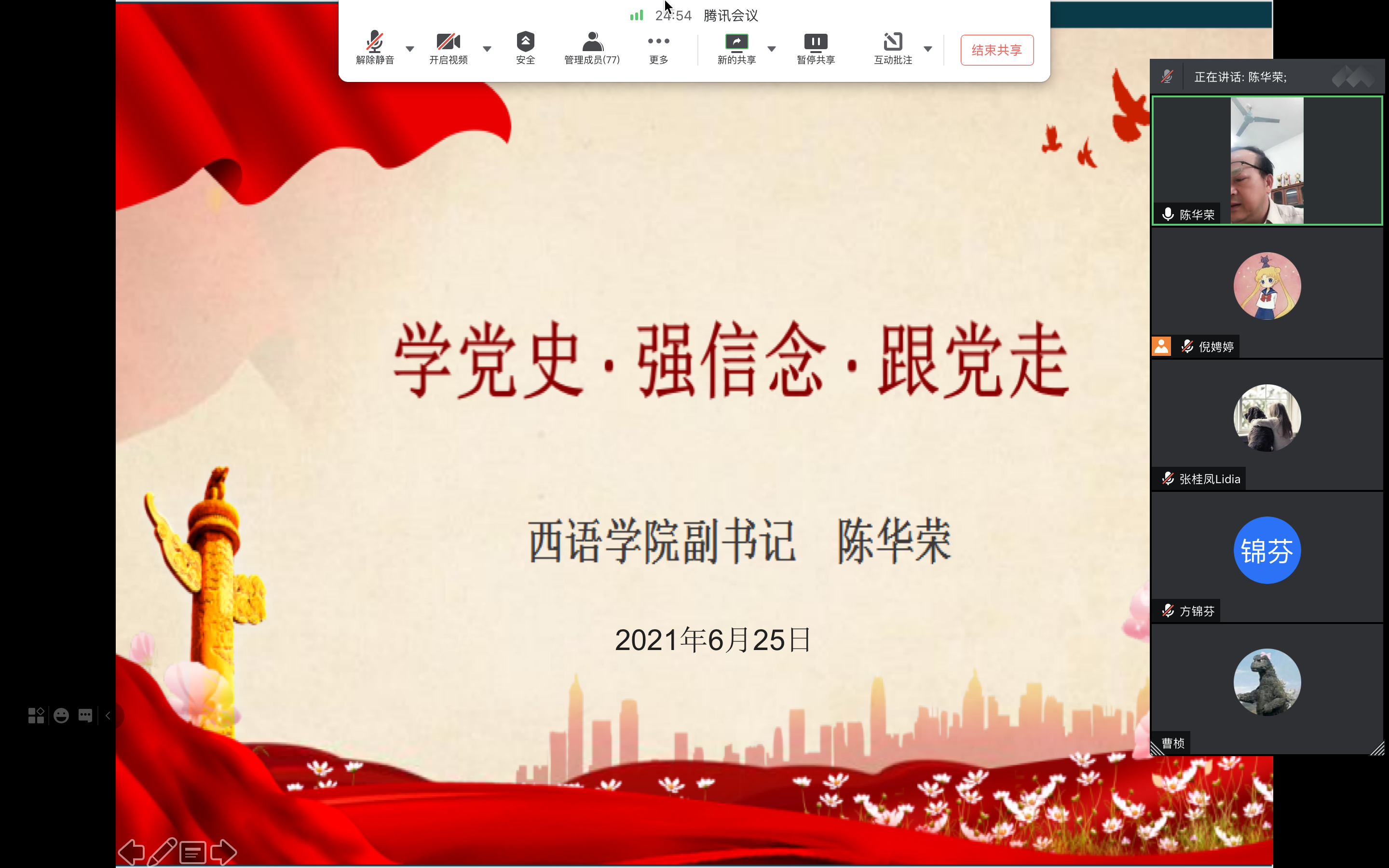 陈华荣副书记结合自身的工作经历,指出在这个百年未有之大变局中,只有时刻牢记初心和使命,才能立足社会,用奋斗书写青春最亮丽的底色,并为毕业生党员提出了5点希望:一是牢记党员身份。毕业生党员从员工变成了员工,从公司走向了社会,铭记自身党员身份,理性面对挫折和困难,做事三思而后行,发挥好党员的先锋模范作用。二是坚定信念、初心不改。为社会、为集体多做些力所能及的事情,尽己所能去帮助身边有困难的群众,坚定为人民服务的宗旨。3.坚持学习、追求卓越。持之以恒地学习党的理论知识、学习党章党纪和习近平总书记系列重要讲话精神,带着感情学、带着理性悟、带着使命行,以党性培育修身修德修为,内化于心、外化于行,并从党的百年非凡历程中汲取力量、增强自信、提升本领。4.在学思践悟中锤炼过硬本领。把“学党史、悟思想、办实事、开新局”贯穿始终,把个人的理想追求融入党和国家事业之中,不断增强工作本领和专业素养,学真本领、长真才干;5.保持共产党人的良好精神风貌。树立党员良好的形象,是党和政府取信于民的重要条件,毕业生党员要保持不骄不躁,锐意进取、迎难而上、攻坚克难,切实做到信念过硬、政治过硬、责任过硬、能力过硬、作风过硬,展现当代青年党员的良好精神风貌。