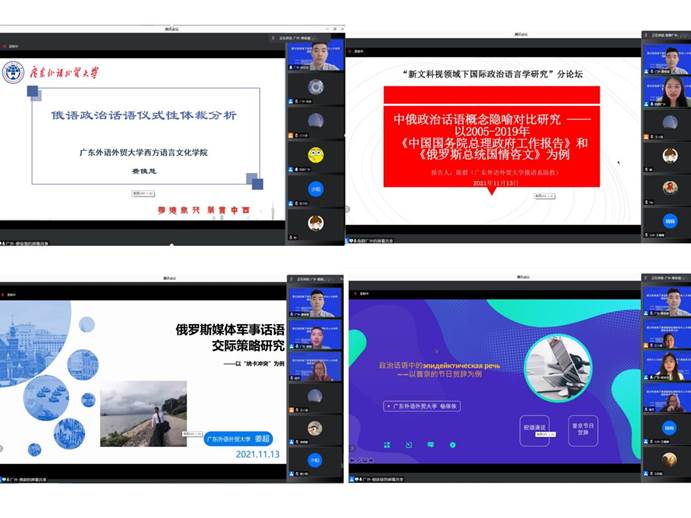 公司俄语系费俊慧副教授主持了下午的“新文科视域下国际政治语言学研究”分论坛并以《俄语政治话语仪式性体裁分析》为题进行了发言。分论坛上俄语系教师陈群的发言《中俄政治话语概念隐喻对比研究——以2005-2019年〈中国国务院总理政府工作报告〉和〈俄罗斯总统国情咨文〉为例》,博士生杨依依的发言《政治话语中的эпидейктическая речь——以普京的节日贺辞为例》和博士生姜超的发言《俄罗斯媒体军事话语交际策略研究》分别展示了公司俄语系师生在政治话语研究方面的最新学术成果。