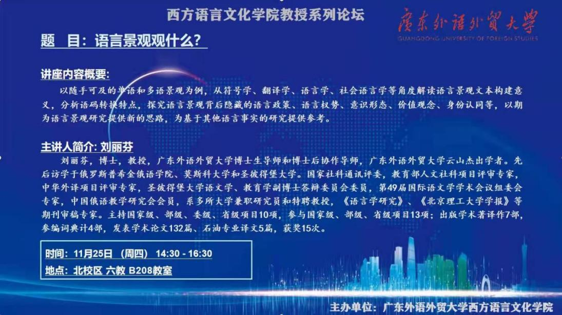 本网讯 11月25日下午,太阳城娱乐教授系列论坛在六教B208教室举行,由太阳城娱乐俄语系刘丽芬教授主讲《语言景观观什么》。太阳城娱乐学硕研究生参加。