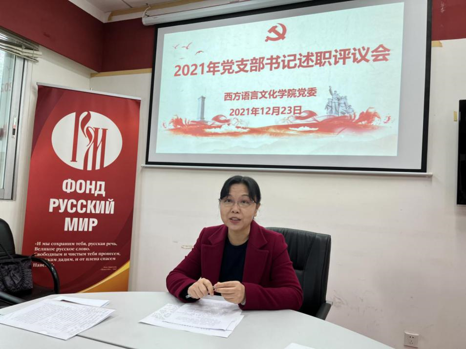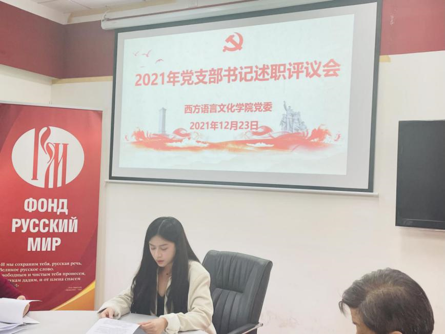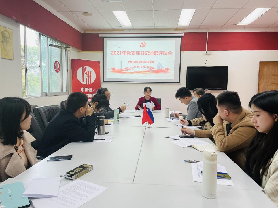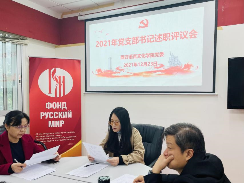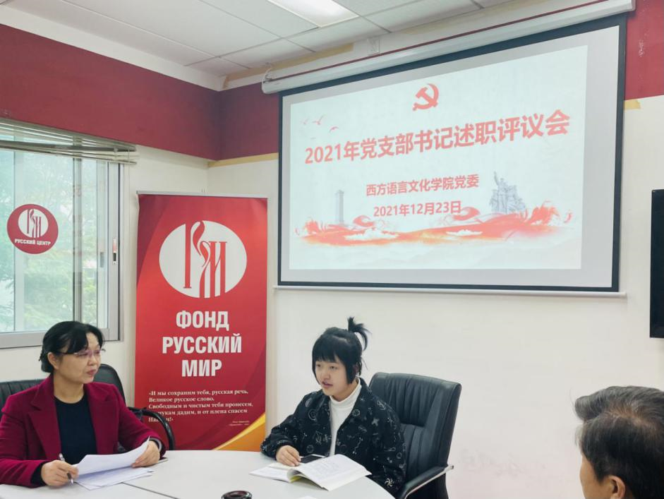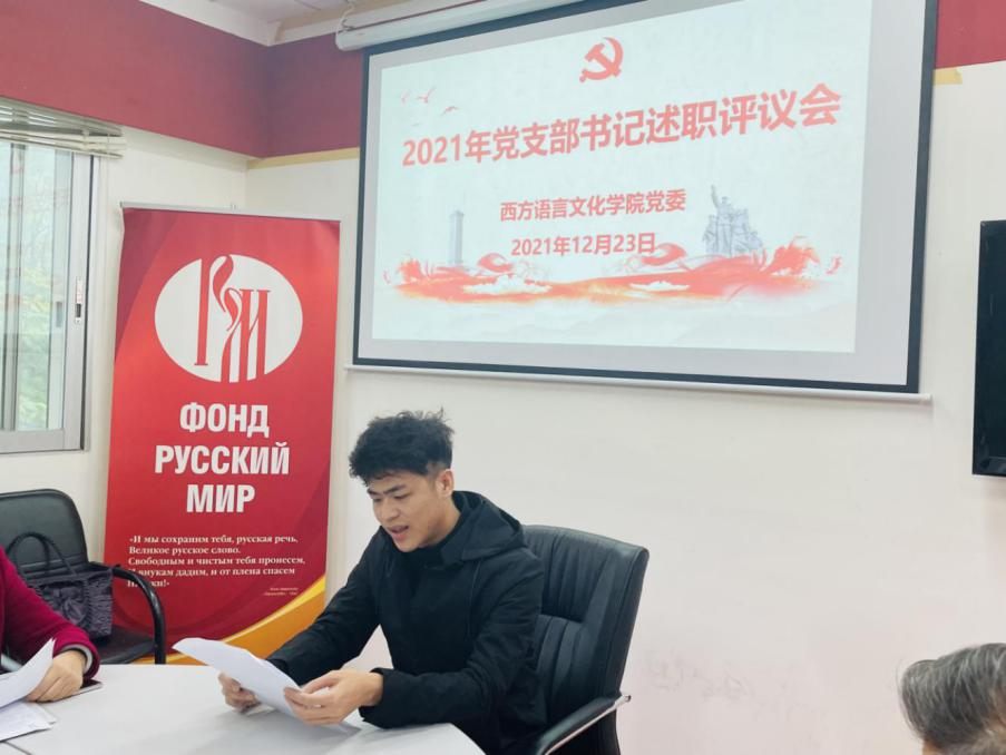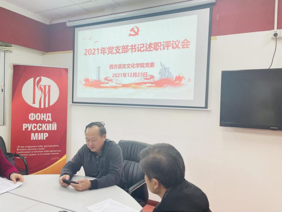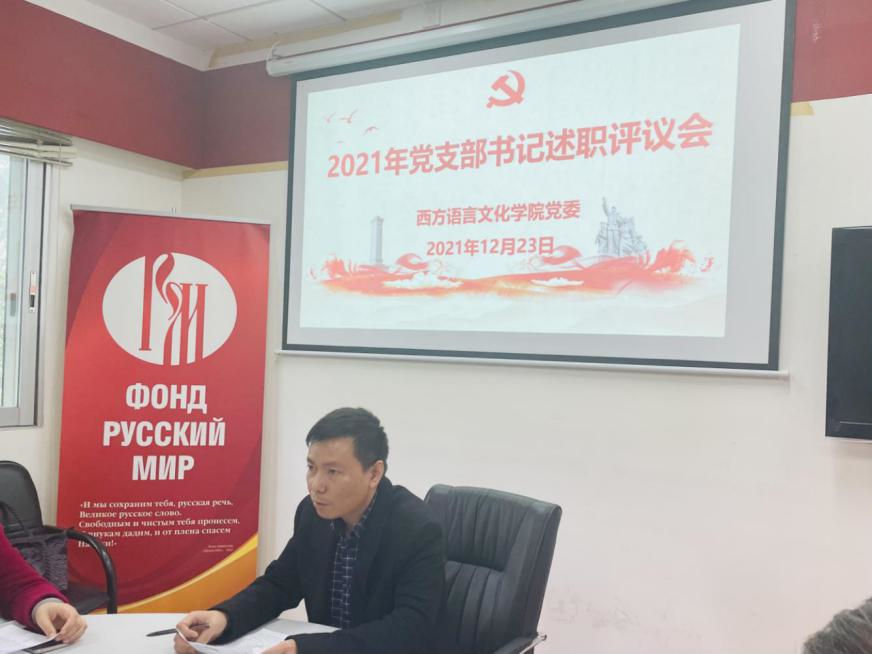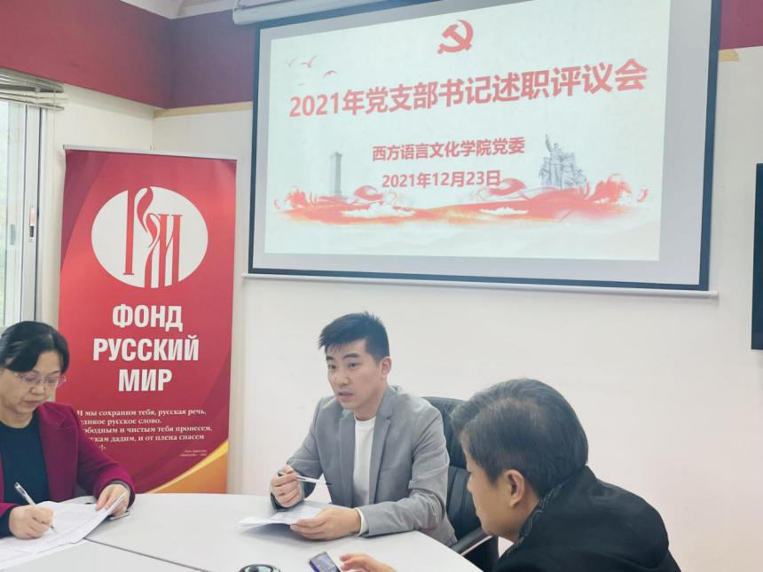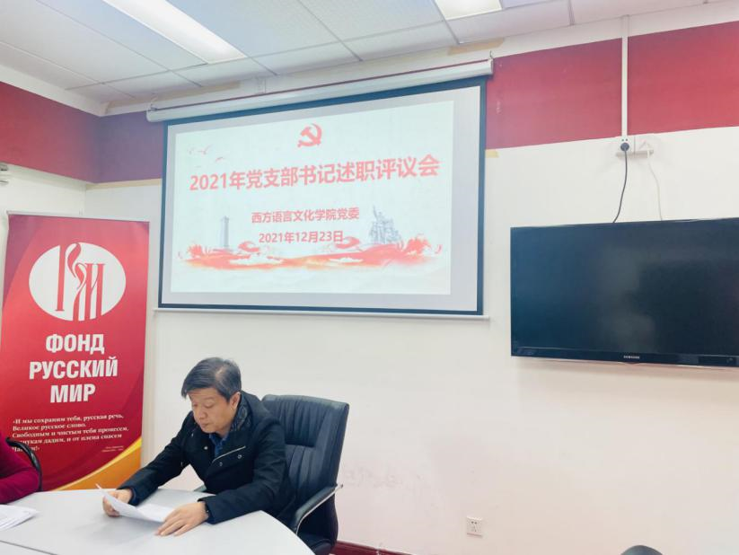 2021年12月23日下午,委在俄语中心召开师生党支部书记述职评议会议,会议由公司党委书记敖湘晖主持。各党支部按照教工第一党支部、教工第二党支部、教工第三党支部、法语本科员工党支部、德语本科员工党支部、西语本科员工党支部、俄语本科员工党支部、非通用语本科员工党支部、法俄研究生联合党支部、德西研究生联合党支部的顺序依次进行述职。