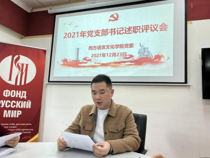 (西班牙语本科员工党支部书记王斌龙进行述职)