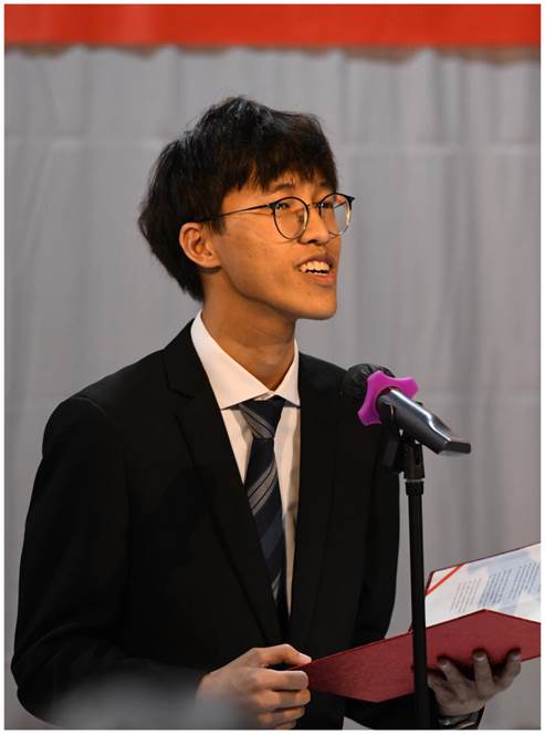 朗诵节目由吴浩添同学献上。吴浩添同学以饱满的感情、娴熟的朗诵技巧演绎了三首风格各异的诗歌:叶赛宁《莎甘奈》、普希金《冬天的夜晚》、莱蒙托夫《祖国》,赢得了观众们的一致赞赏。