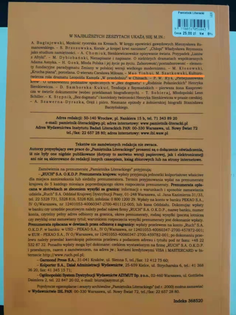 摘要: 广外波兰语系茅银辉教授以第一作者身份在最新一期AHCI目录期刊《Pamiętnik Literacki》(文学日志)上发表学术论文《波兰剧作家廖抗夫的<夜未央>在中国的文化影响》。