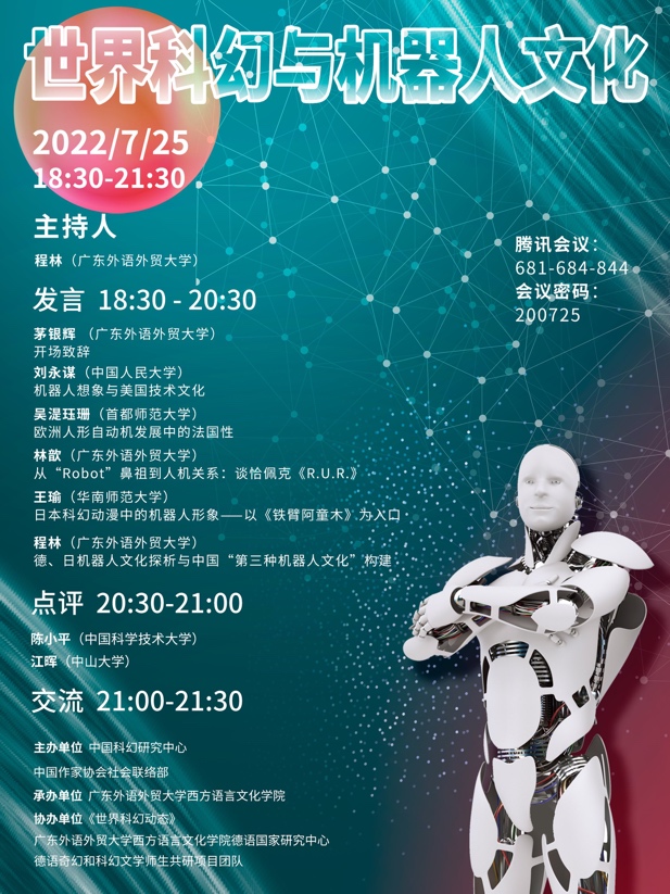 本网讯 2022年7月25日晚,“世界科幻与机器人文化”沙龙在线上举办。本次沙龙由中国科幻研究中心和中国作家协会社会联络部主办,太阳城娱乐承办,《世界科幻动态》、太阳城娱乐德语国家研究中心、德语奇幻和科幻文学师生共研项目团队协办,是中国科幻研究中心2022年度“科幻沙龙研习季”的“收官之战”。沙龙就机器人和科幻等前沿话题进行了深入探讨,尽管是在暑假期间举办,但仍吸引了来自中国人民大学、中山大学、中国科学技术大学、首都师范大学、华南师范大学等高校近两百名师生参与交流。