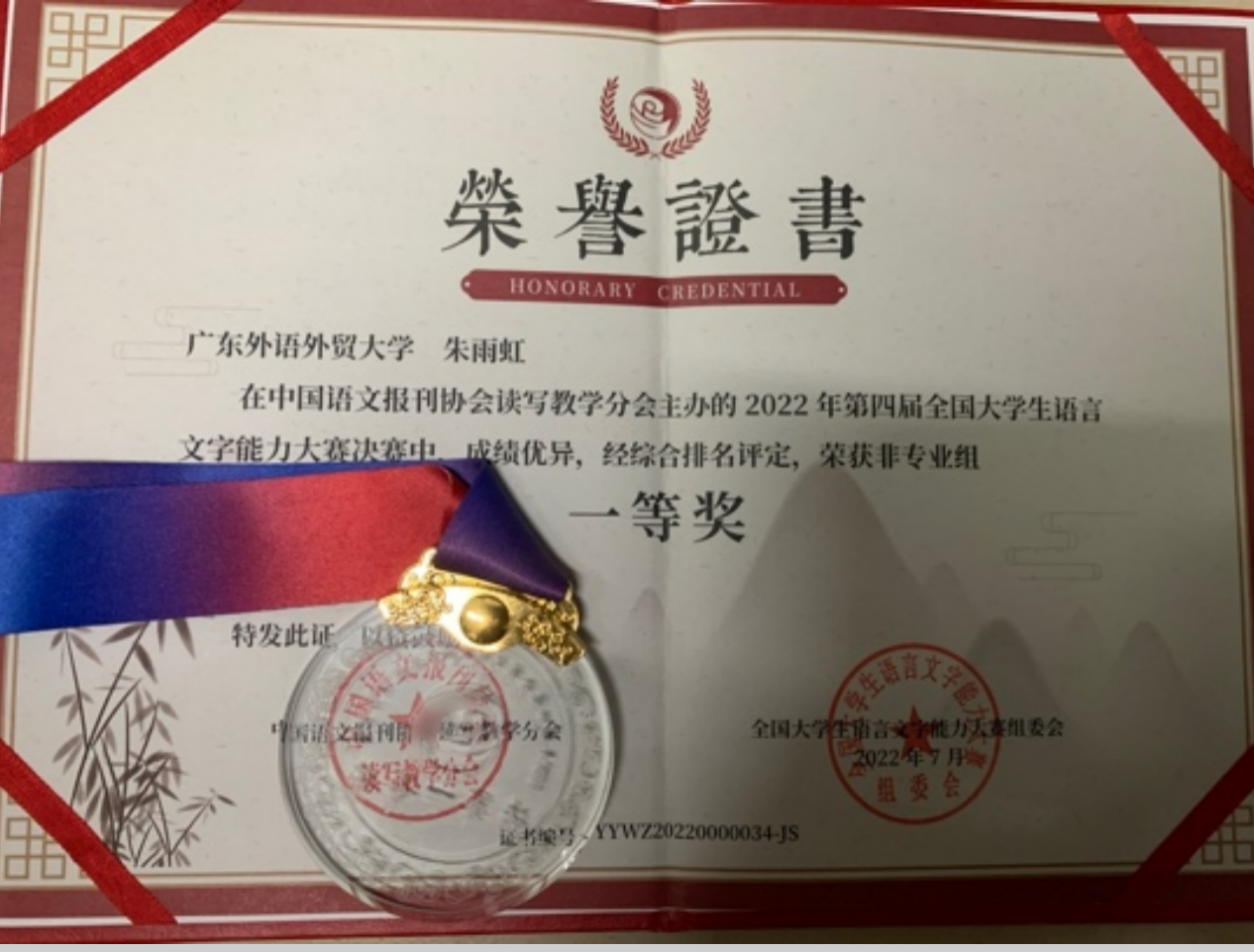 本网讯 2022年7月,公司葡萄牙语系2019级本科生朱雨虹同学在第四届全国老员工语言文字能力大赛决赛中获得非专业组一等奖。此次大赛由中国语文报刊协会读写教学分会主办,共有来自1919所院校近1.2万名选手参赛,691所高校2000名选手晋级全国决赛。受疫情影响,今年的决赛采用线上提交作品的形式,配合智能摄像监考系统同步进行。公司学子与来自清华大学、北京理工大学、南京师范大学等实力强大院校的员工同台较量,凭借其扎实的语言基础最终脱颖而出。