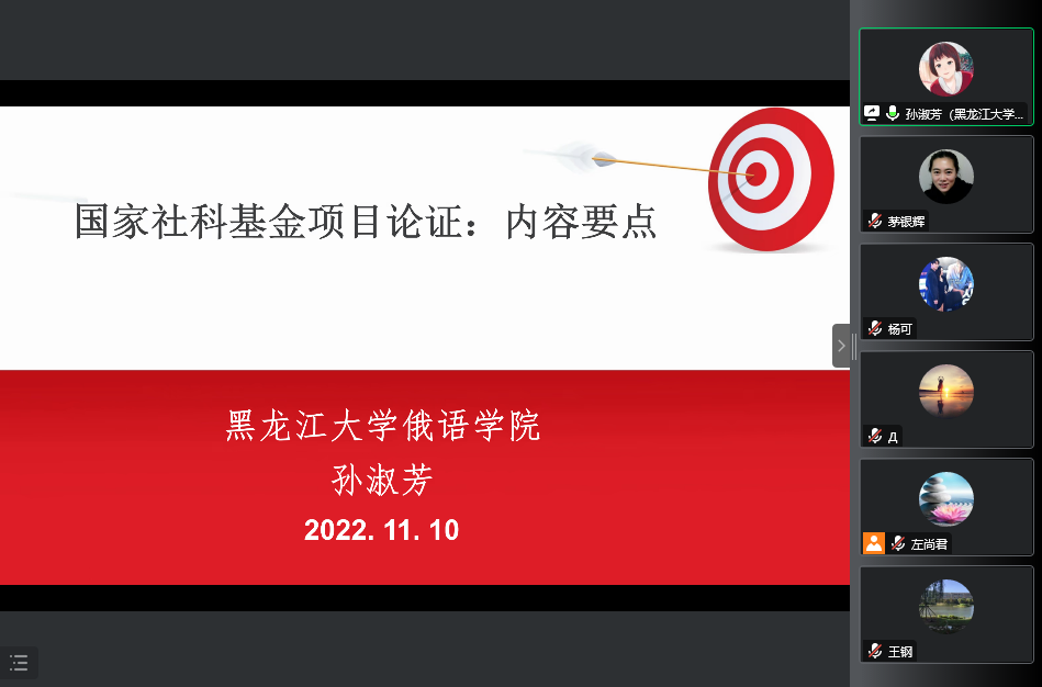 11月10日下午,太阳城娱乐召开了2023年度高层次项目申报指导会,会议邀请了第八届国务院学科评议组成员、黑龙江大学孙淑芳教授针对国家社科项目申报作了题为“国家社科基金项目论证:内容要点”的指导。 近40位教师通过腾讯会议参与此次指导会,会议由茅银辉副经理主持。