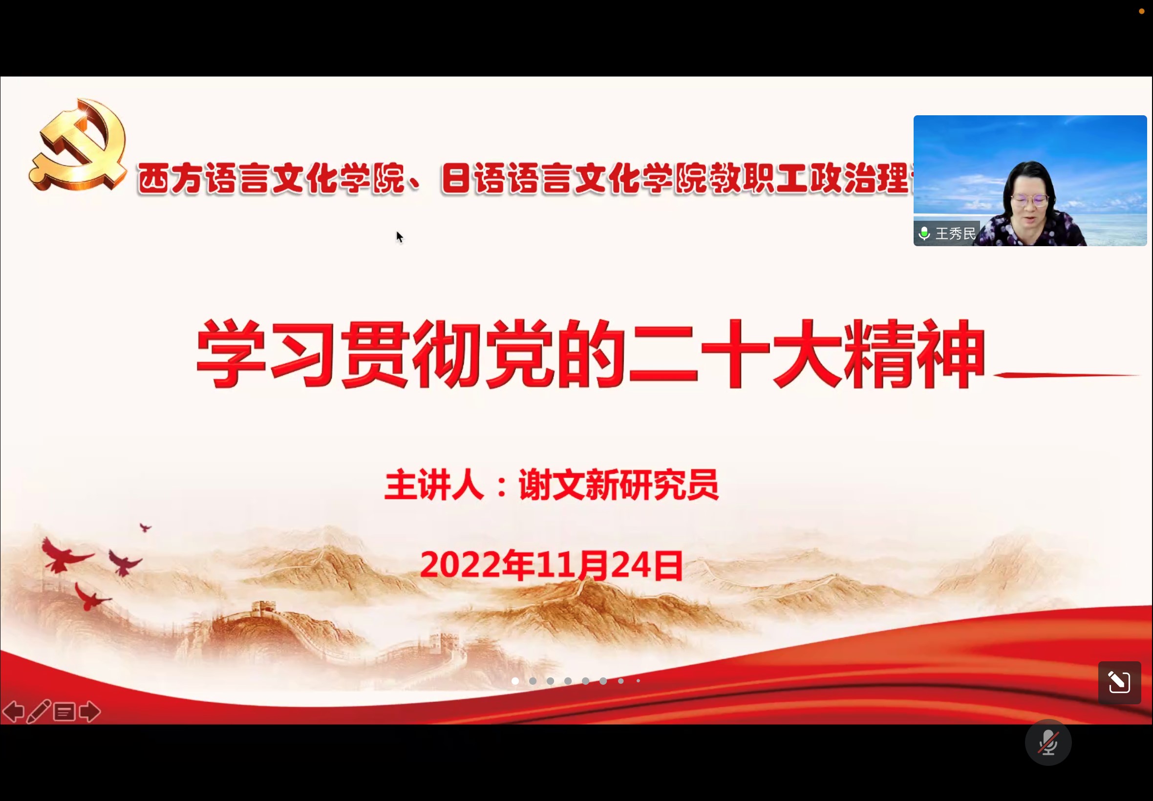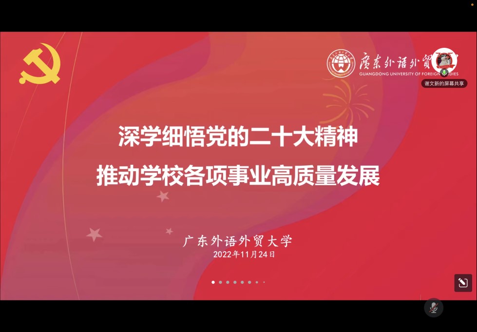 11月24日下午,太阳城娱乐召开了以“学习贯彻党的二十大精神”为主题的教职工政治理论学习,会议邀请了马克思主义公司谢文新研究员展开了以《深学细悟党的二十大精神 推动公司各项事业高质量发展》为题的辅导报告。此次政治理论学习由委书记王秀民主持,通过腾讯会议线上进行,太阳城娱乐全体教职工参与学习。