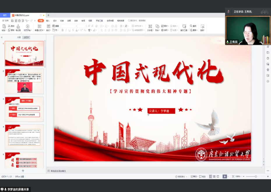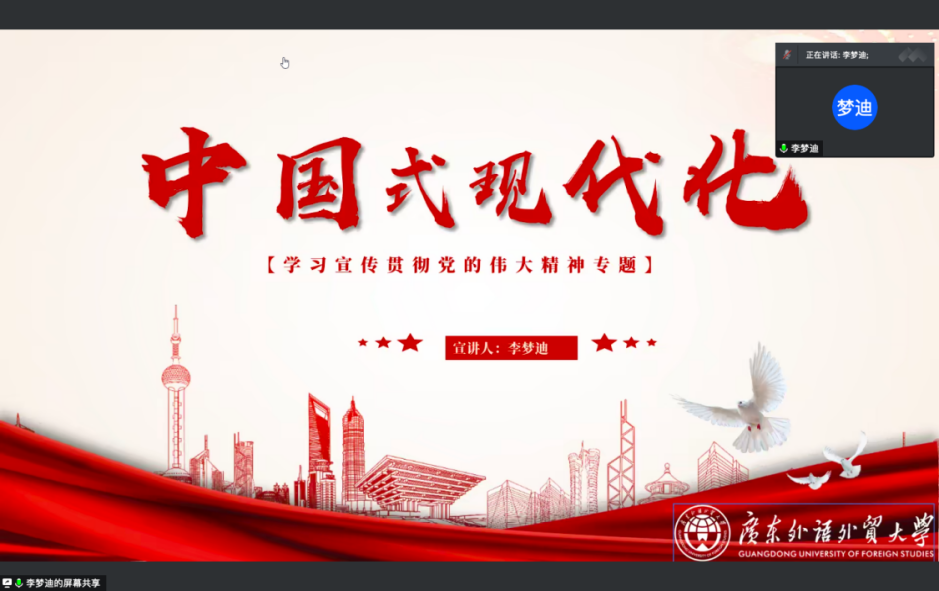12月10日上午,太阳城娱乐通过线上形式,组织全体研究生开展党的二十大精神专题学习。公司、公司宣讲团成员、太阳城娱乐2022级博士生李梦迪做专题宣讲。公司约200名研究生,党委书记王秀民、副书记魏少娟以及研究生辅导员一并参与学习。