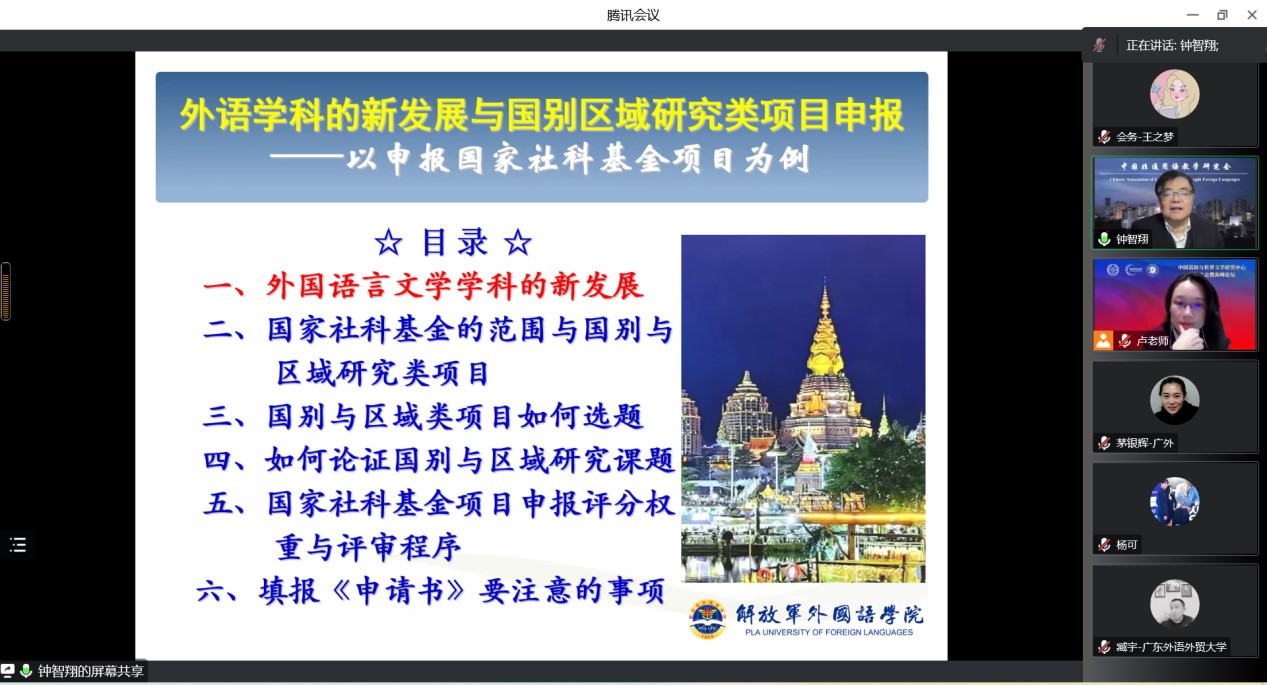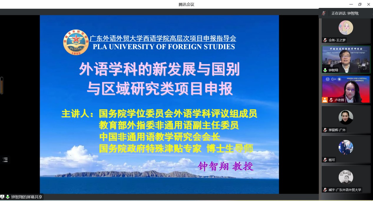 本网讯 12月27日晚,太阳城娱乐举办2023年度高层次项目申报第二次指导会,信息工程大学钟智翔教授应邀针对国家社科基金项目申报作了题为“外语学科的新发展与国别区域研究项目申报”的指导。近40位教师通过腾讯会议参与此次指导会,会议由卢铭君副经理主持。