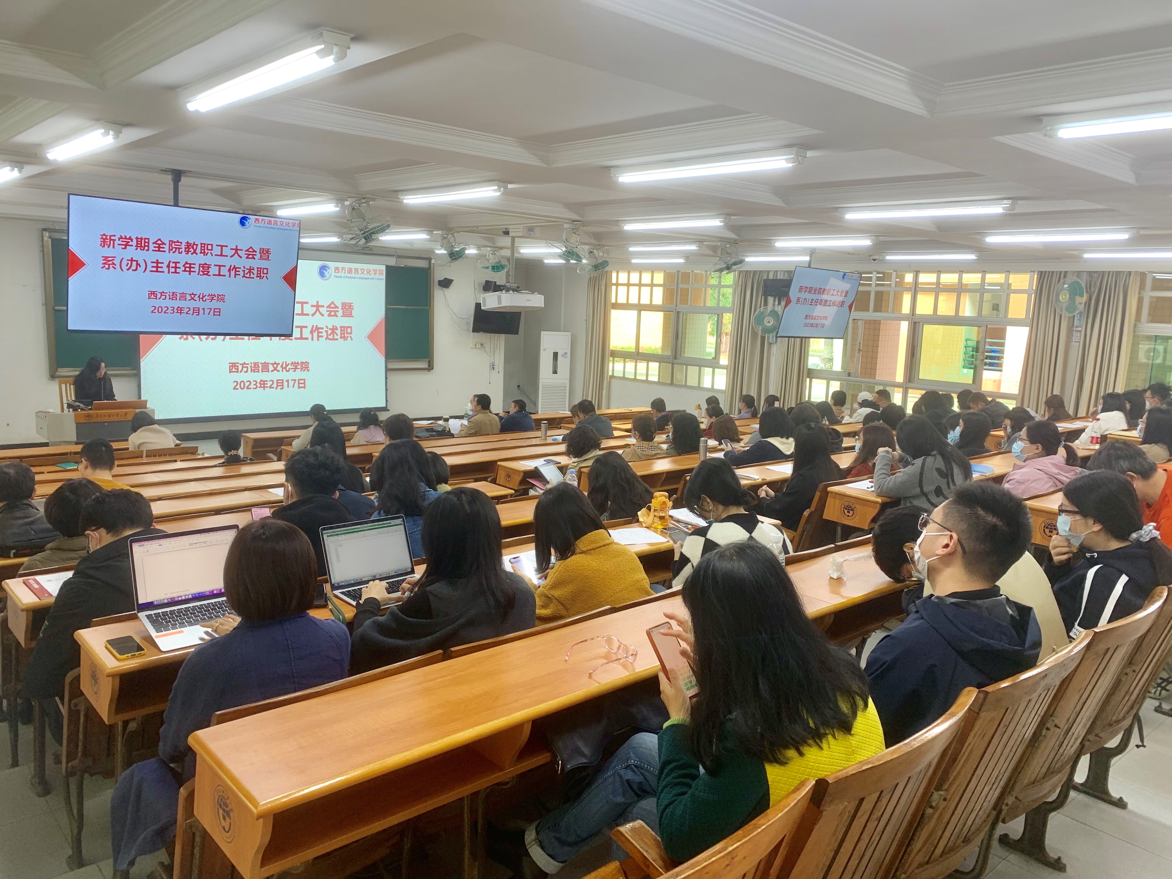 2023年2月17日,太阳城娱乐在二教116教室召开了新学期全院教职工大会暨系(办)主任年度工作述职大会,公司领导班子、全院教职工共计80余人出席会议。会议由公司党委书记王秀民主持。