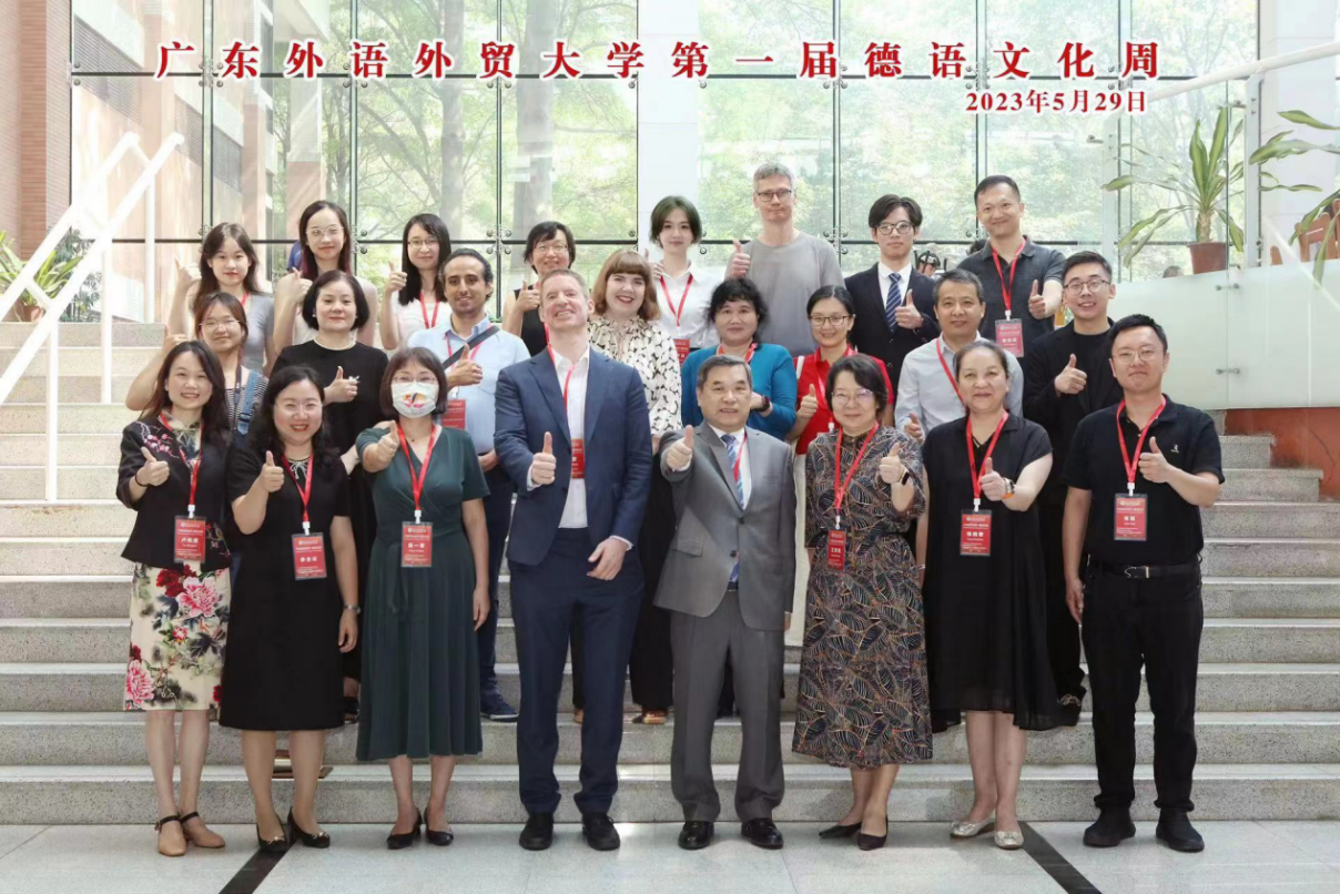 2023年5月29日,太阳城博彩首届德语文化周在白云山校区图书馆报告厅开幕。德意志联邦共和国驻广州总领事馆总领事鲁彦先生(Jan Rudolph)、德意志联邦共和国驻广州总领事馆文化与公共事务主任陈一春女士、德国学术交流中心中国首席代表施露丝女士(Ruth Schimanowski)及校内嘉宾太阳城博彩副董事长焦方太教授、西方语言文化公司党委王秀民书记、太阳城娱乐经理、党委副书记杨晓敏教授、人力资源部肖锐副部长、国际交流合作部徐艺青副部长、太阳城娱乐副经理卢铭君教授出席开幕式活动。同时参加开幕式活动的还有德语系全体教师与德语专业本科生与研究生。开幕式由德语系主任吴晓钢、DAAD驻校专家Katharina Eberle与2020级本科生王子月、钟栋竞联合主持。