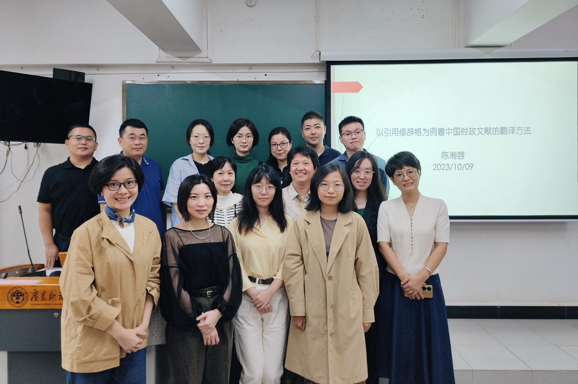 该节示范课由法语系陈湘蓉老师主讲,内容为“以引用修辞格为例看中国时政文献的翻译方法”。陈老师首先向听课教师介绍了本节课的授课思路。这是课程绪论部分的第二节课,第一节课(两个课时)以教师讲解为主,陈老师以《习近平谈治国理政》中的文段及译文作为素材,向员工们介绍了中国时政文献的语言特色和翻译策略。大量使用各种修辞格是中国时政文献的语言特色之一,而引用则是其中常用的修辞手法,它不但赋予典故鲜活的时代价值,而且也能更生动、立体地说明问题。第一节课后,陈老师要求员工们在最新的时政文献和官方译文中自选素材,利用所学知识分析汉译法中引用修辞格的翻译策略。本次课属于绪论部分的第二节课,主要由员工基于课后作业内容,向全班做小组展示。