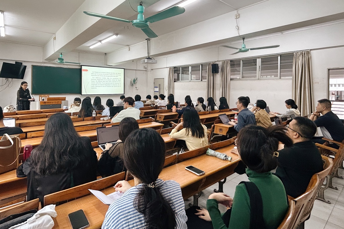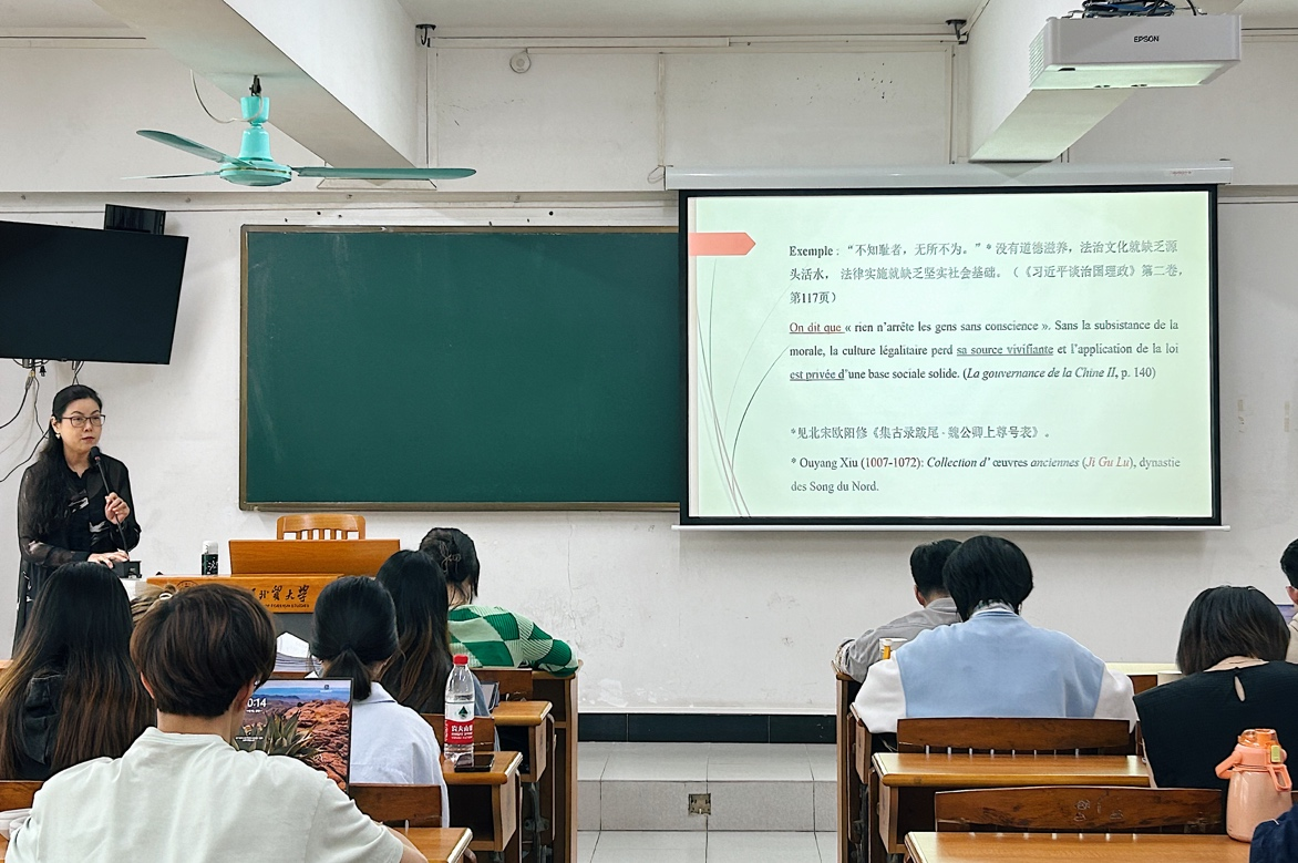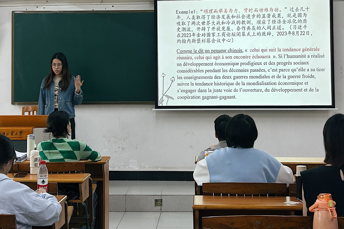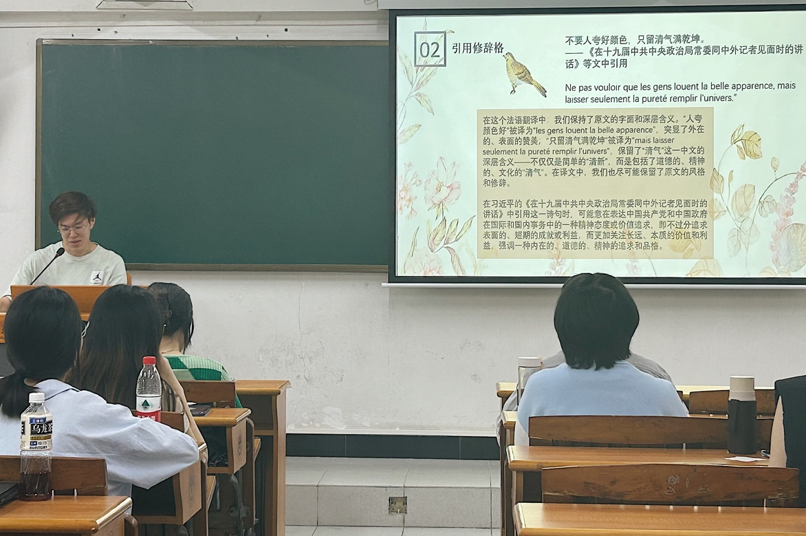 在安排小组展示前,陈老师再次强调了引用修辞格的定义、分类、重要性及翻译时的注意事项,并结合实例辨析了汉语和法语两门语言中修辞格的不同特点。随后,员工结合所学知识并借助PPT等形式分组展示了作业内容,分析了时政文段所引用的古文、诗歌、典故的作者、出处、意义,并讲解了法语译文中引用修辞格的翻译策略和技巧。展示过程中师生互相提问,共同梳理重难点,课堂气氛活跃。